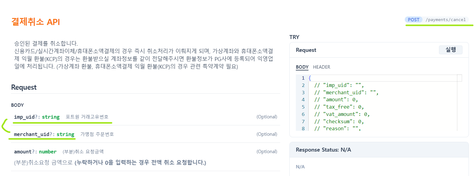 ์ฃผ์ํ ์ ์ BODY์ ๋ชจ๋ ๋ถ๋ถ์ด Optional๋ก ์ฃผ์ด์ ธ์์ง๋ง, imp_uid์ merchant_uid ๋ ์ค ํ๋๋ ํ์๋ก ์ ๋ ฅํด์ผ ํ๋ค.